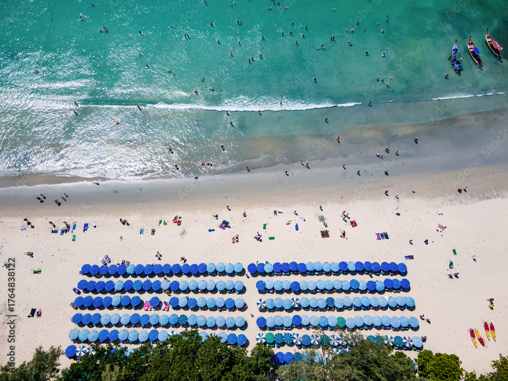 Blue beach umbrellas with many tourists relaxing on the sand and swimming in the sea at Kata beach, a famous summer destination in Phuket, Thailand. Aerial view of tropical shore of Andaman sea.