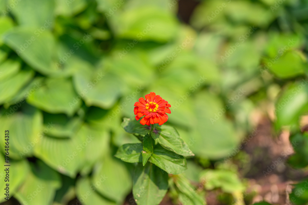 A Vibrant Red Flower Beautifully Surrounded by Lush Green Foliage, Capturing Natures Essence