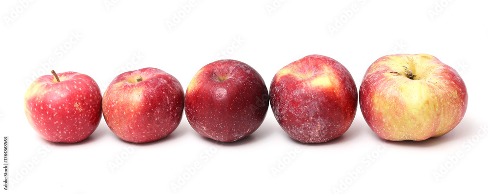 Five red apples in a row on white background. Fresh organic fruits symbolizing health and diet. Natural sweet harvest rich in vitamins and flavor. Clean isolated studio composition.