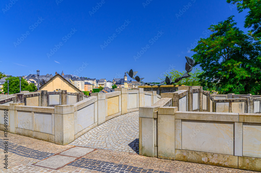 Fontaine aux colombes Fountain with dove of peace sculpture and small bridge in Judiciary Cite judiciaire Justice quarter in Ville Haute quarter with Luxembourg City historical centre background