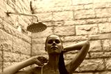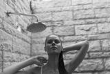 young woman with wet hair enjoying outdoor stone wall shower under natural water flow, relaxed mood, warm lighting, summer bathing experience