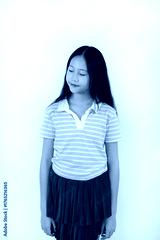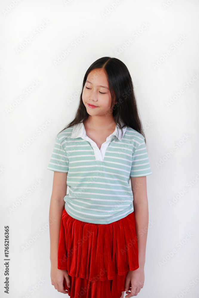 Asian girl looking down with smile while standing against white background. Child confidence looks great with sweet and stylish.