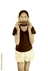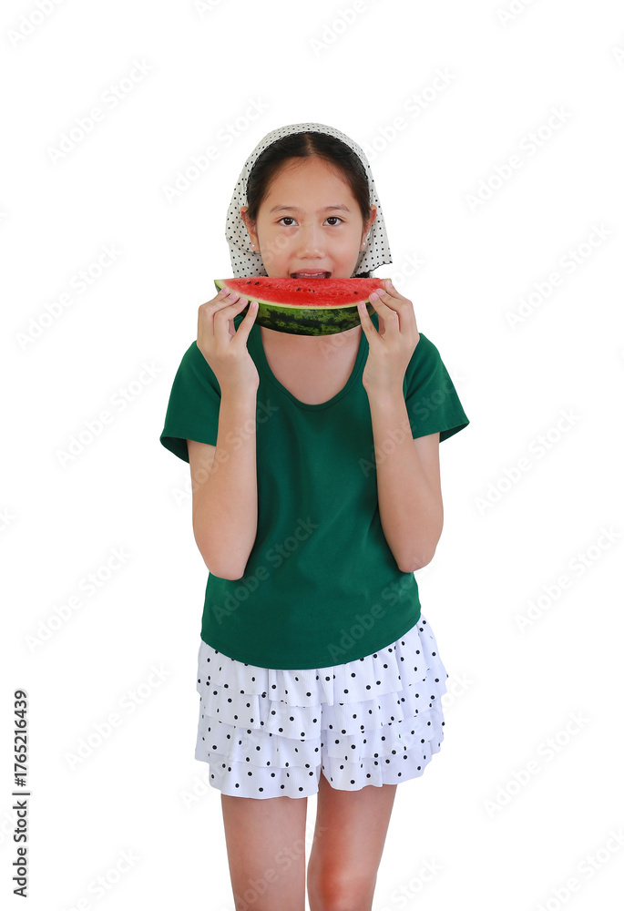 Smiling Asian girl happily biting into slice fresh watermelon. She wearing dark green t-shirt, white polka dot shorts, and a polka dot bandana, capturing a refreshing summer moment.