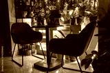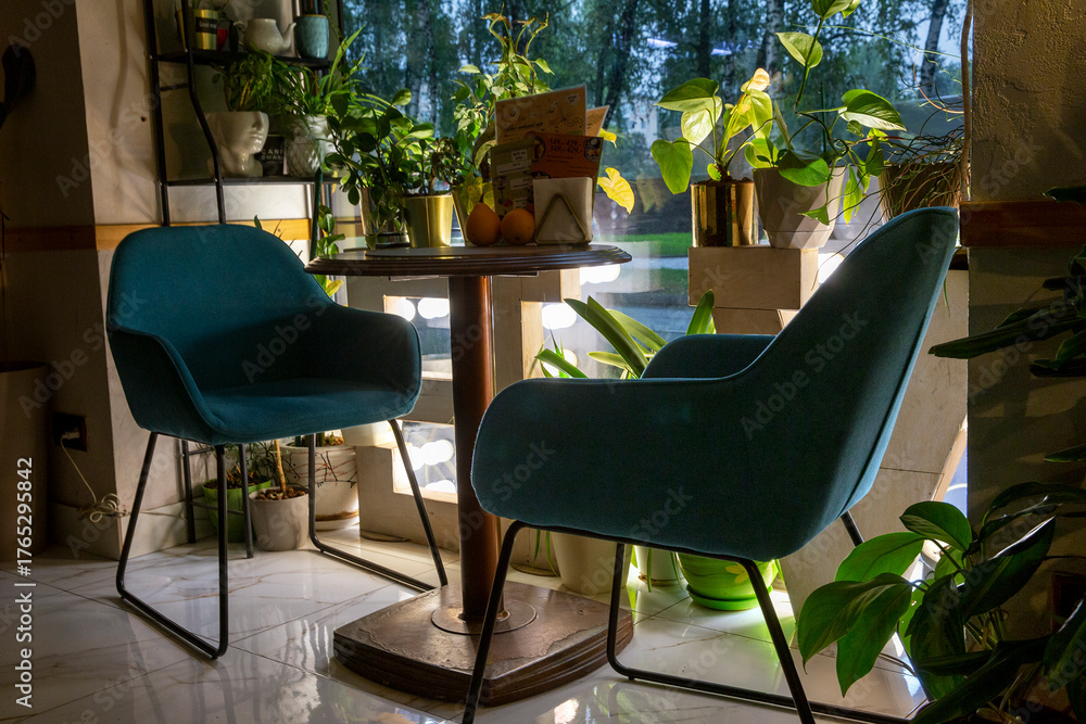 Interior of cozy cafe in evening. Table by the window and live plants with lighting