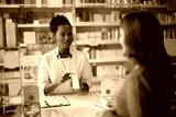 Black female pharmacist advising a woman who is buying medicine in pharmacy.