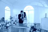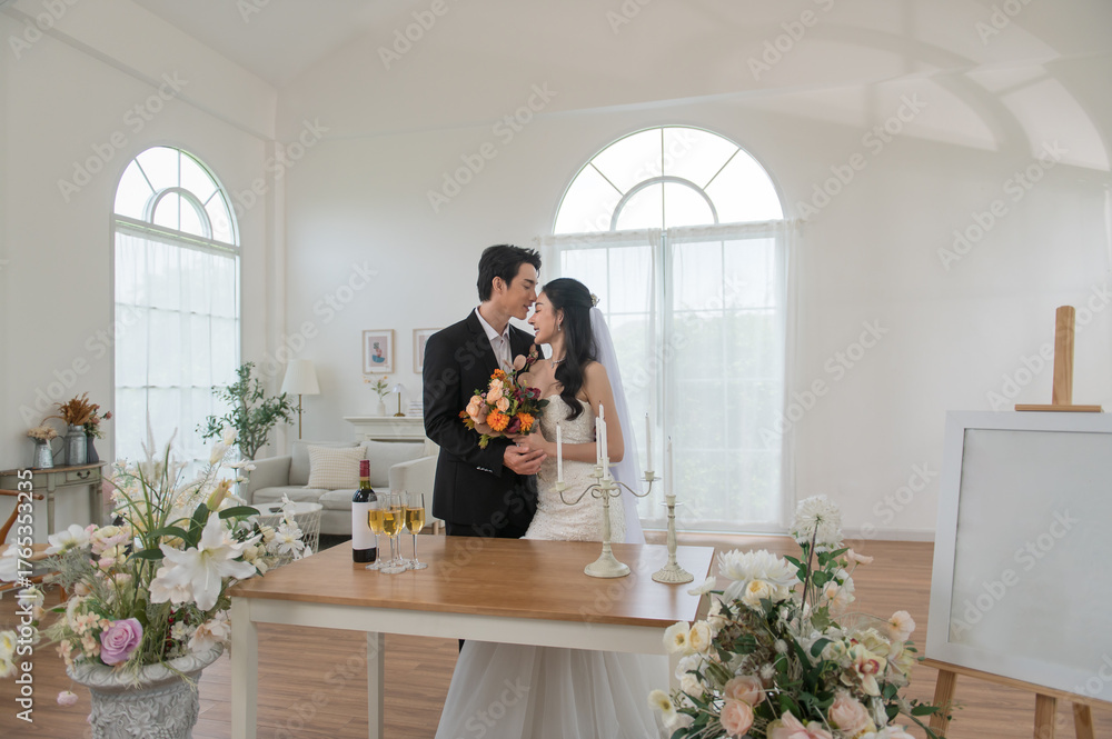 Romantic Asian couple bride and groom holding bouquet and smiling in wedding ceremony