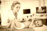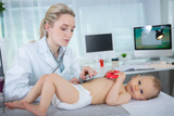 pediatrician doctor listens to baby heartbeat with stethoscope