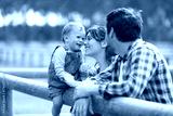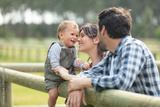 happy family of three lying in the forest