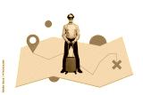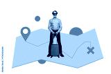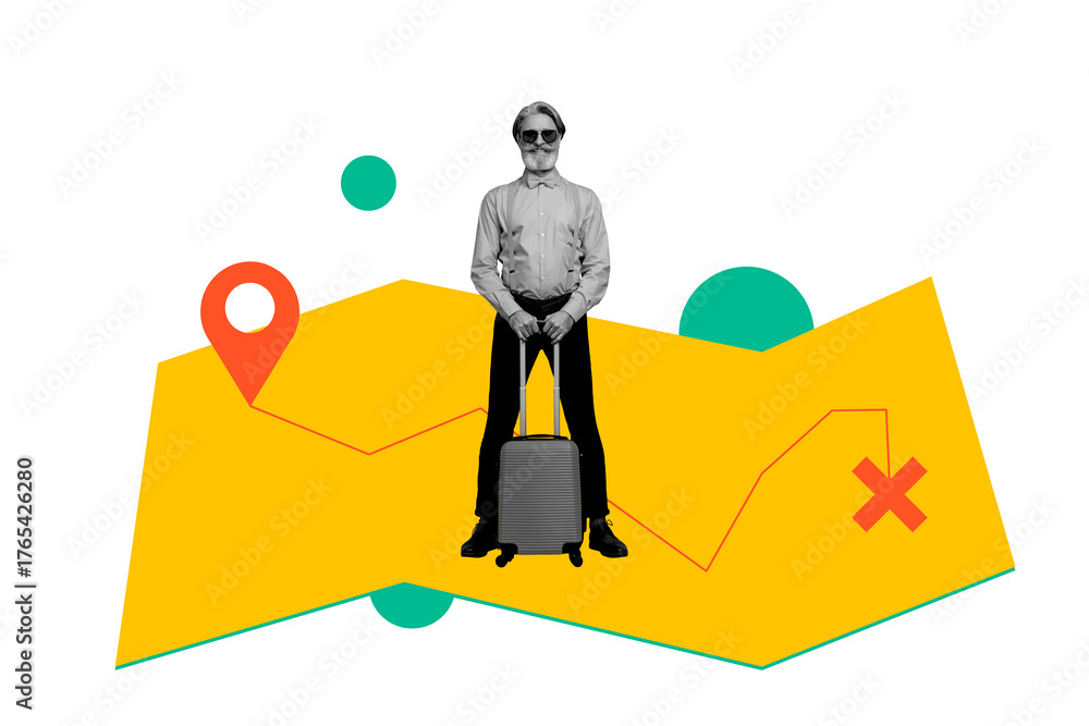 Composite photo collage of happy man pensioner hold suitcase summer map travel gps adventure trip isolated on painted background