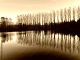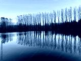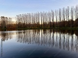 autumn trees silhouettes reflection on the still lake surface, twilights time, natural sky colors after the sunset