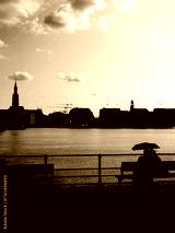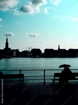 rainy day at the city lakeside, people with umbrellas, romantic atmosphere, vintage style