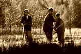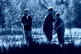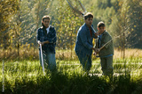 Caucasian middle aged man fishing with Caucasian teenage girl and Caucasian boy near grassy riverbank, holding fishing rods and net, all focused on water, outdoor nature setting