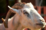 Goat standing outdoors with head turned to side, showing large curved horns and fur, sunlight highlighting animal's face, background featuring blurred fencing and natural elements