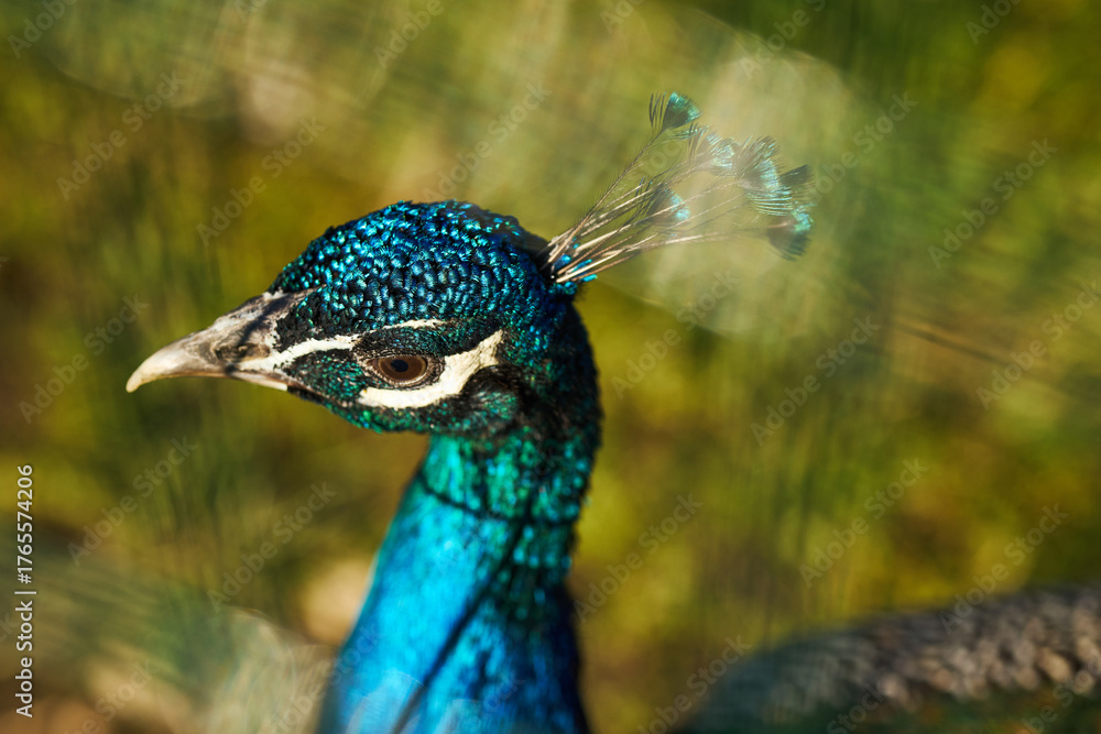 Closeup of peacock standing outdoors with vibrant blue and green plumage, detailed head and crest feathers visible, natural background softly blurred in sunlight