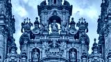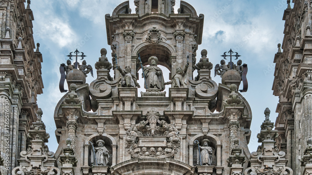 Primer plano parte alta fachada del Obradoiro en la catedral de Santiago de Compostela, España, con estatuas al apóstol Santiago