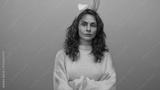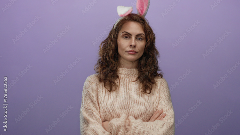Woman wearing bunny ears stands over isolated purple background with folded arms and neutral expression, capturing a playful yet reserved mood with a soft knit sweater.