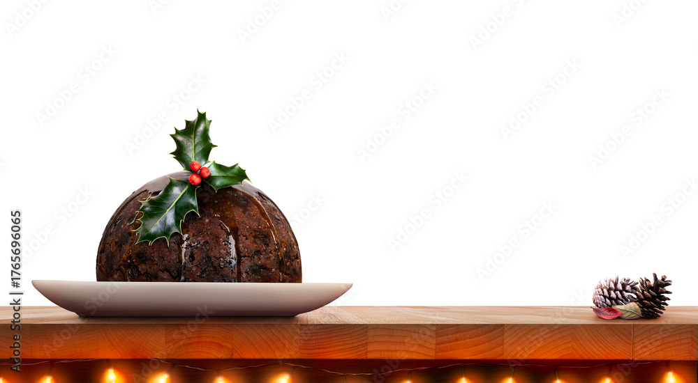 A level view of a traditional Christmas pudding on a square plate with holly on top of a wooden table and Christmas lights isolated against a transparent background.