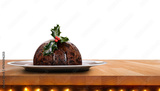 A low view of a traditional Christmas pudding on a round plate with holly on top of a wooden table and Christmas lights isolated against a transparent background.