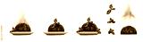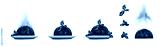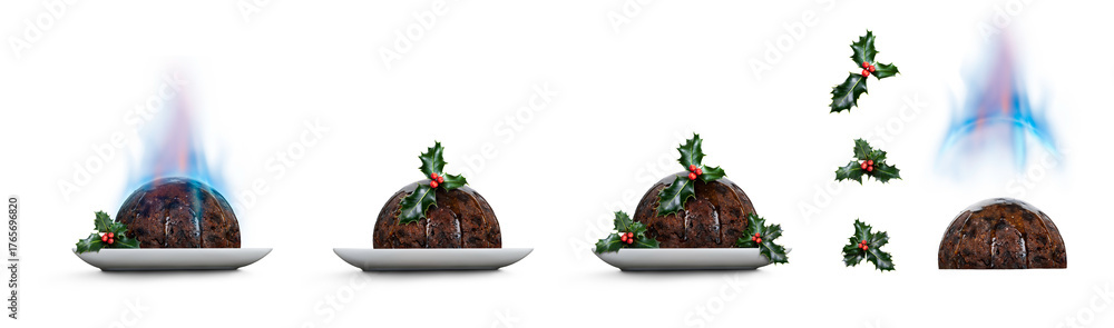 A level view of three half round traditional Christmas pudding with holly on a white square plate isolated against a transparent background with blue flame, holly and separate pudding design elements.