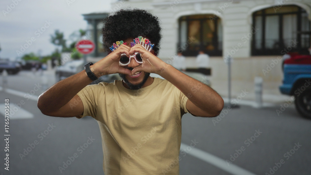Man with birthday glasses smiling in a city street, making heart gesture, embodying joy and celebration in an urban outdoor setting.