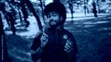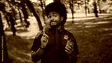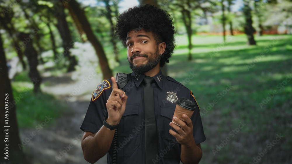 Police officer in uniform holds coffee cup and gestures in a sunny park setting surrounded by green trees.