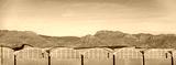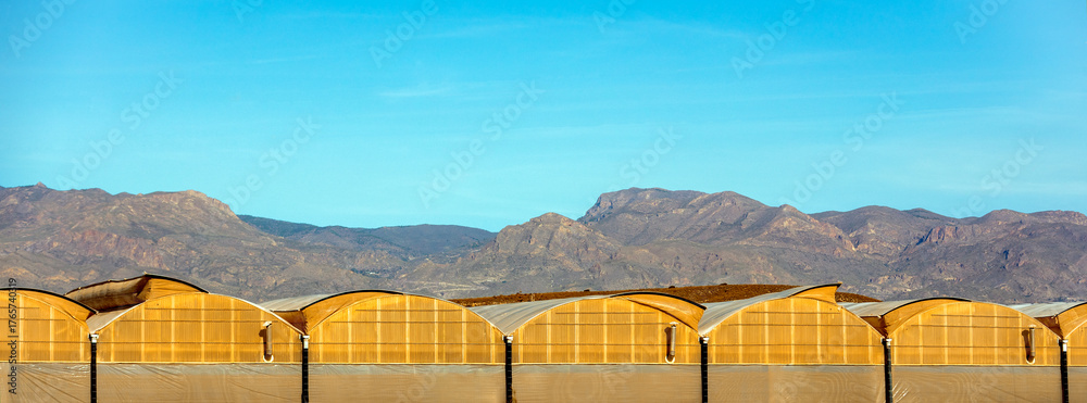 A view of rows of greenhouses against a mountain range in southern Spain. Horizontal banner