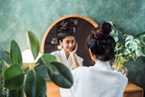 Pretty Indian woman enjoying skincare routine in front of mirror - skincare, beauty, selfcare, mirror, routine.