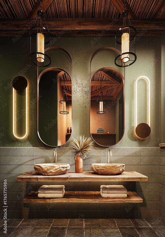 Contemporary bathroom interior design with green tiles and green walls. Modern bathroom. 3D Rendering, 3D Illustration