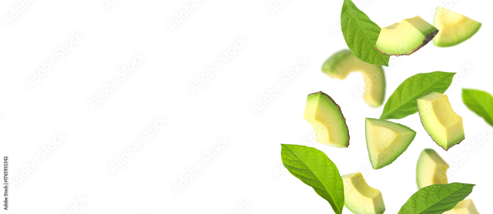 Fresh avocado slices and green leaves falling on white background
