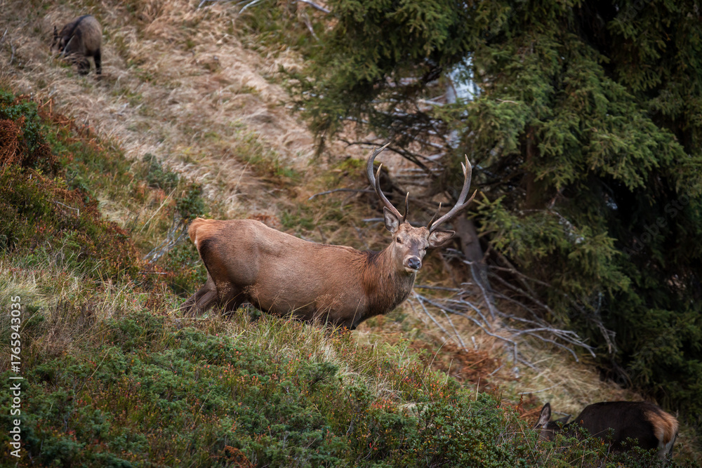 a red deer stag, cervus elaphus, on the mountains in the rutting season at a autumn morning