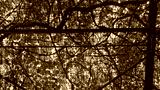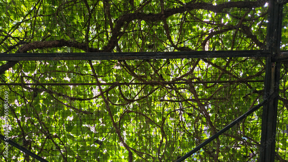 A low-angle view looking up at a dense natural canopy of vibrant green leaves and tangled brown vines supported by a dark metal lattice or pergola structure.