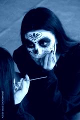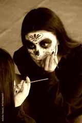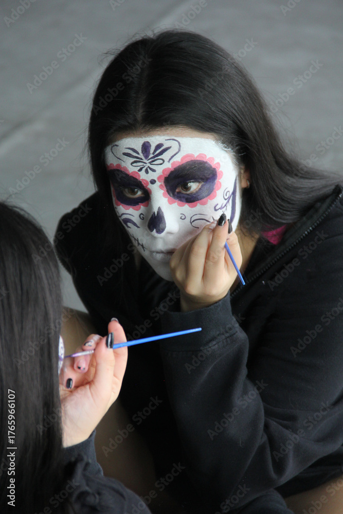 18-year-old Mexican woman puts on catrina skull makeup in front of the mirror to celebrate the Day of the Dead festival in Mexico