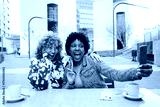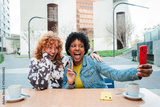Two enthusiastic friends are joyfully taking a selfie together, capturing their fun moment in the cafe. Their excitement is palpable as they smile and pose with their smartphone for a perfect picture.