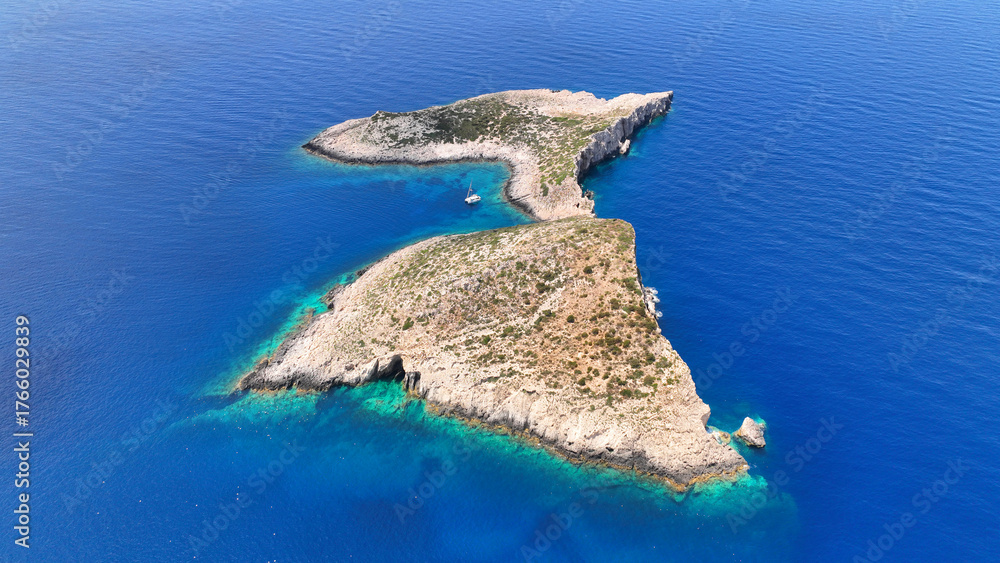 Aerial drone photo of breathtaking scenery in a small islet neat Porto Vromi visited by yachts, Zakinthos island, Ionian, Greece