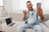 Happy man engaging in a video call, sitting comfortably on a couch, wearing casual attire, showcasing a bright and modern interior with a laptop nearby.