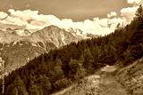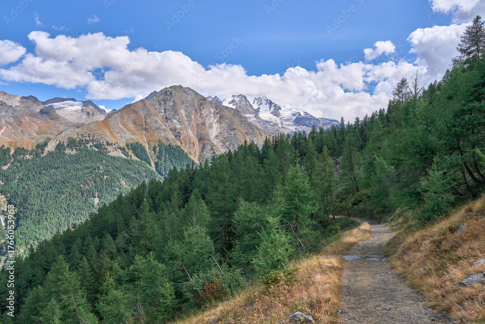 Mountain landscapel in Gran Paradiso national park in Italy. Hiking trail in high altitude. Forest of green coniferous trees. Summer holidays in Italy for all family