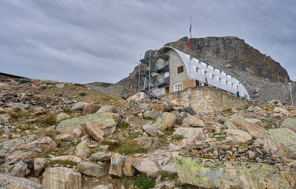 The Vittorio Emanuele II refuge in the Graian Alps in the heart of the Gran Paradiso National Park, Italy. A starting point for climbing mount Gran Paradiso. Rain clouds in the sky.