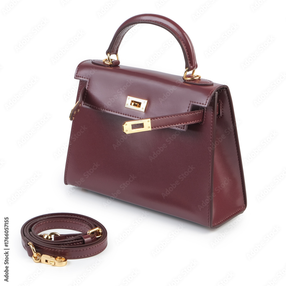 Luxurious women’s handbag in deep burgundy leather with elegant gold fittings. Product image for fashion, advertising, and e-commerce showcasing timeless elegance and premium quality.