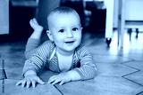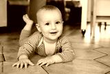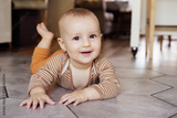 Happy, laughing baby lying on tiled floor at home for child development, wellness and growth. Cheerful active little infant kid training physical skills, smiling, learning to crawl, playing and relax.