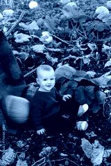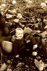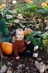 Cute baby sitting near wheelbarrow with pumpkins on pumpkin patch. Selecting best pumpkins for Thanksgiving and Halloween holidays decoration on farm. Pumpkin harvest. Autumn fall festive mood
