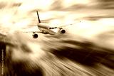 Airplane with motion blur effect. Landscape with flying passenger airplane and blurred background with sky with low clouds, orange forest at sunset. Passenger airplane is landing. Commercial aircraft