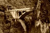 An old bridge opposite the landscape of Tiger Leaping Gorge in Yunnan province of China. Scenic spot where a tiger is said to have leaped across the river, thus giving the gorge its name.