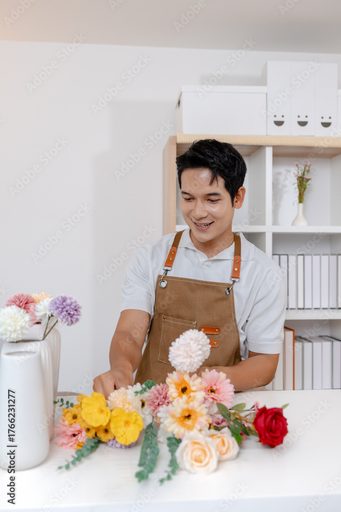 A smiling man wearing an apron arranges colorful flowers in a vase on a table in a cozy room. He appears focused and content while creating a beautiful floral arrangement as part of his work.