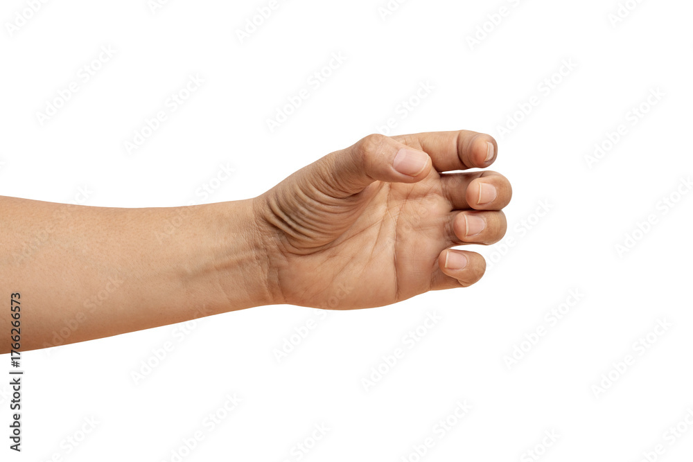 man hand holding something like a bottle on white background