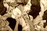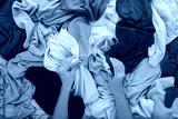 Young adult woman hands holding and sorting cluttered messy colorful t shirts. Making clothes neatness. Closeup. Point of view shot. Flat lay. Top down view.