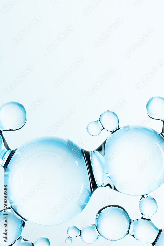 Transparent 3D molecules, liquid water drops, bubbles. Cosmetic products for skin care, hyaluronic. Abstract pattern. Healthcare and medicine designs concept, beauty background.