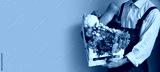 Male farmer with box of vegetables and fruits on beige background with space for text, closeup