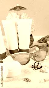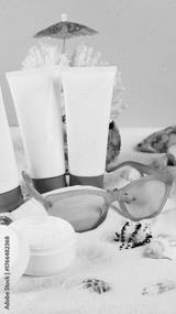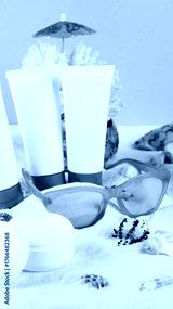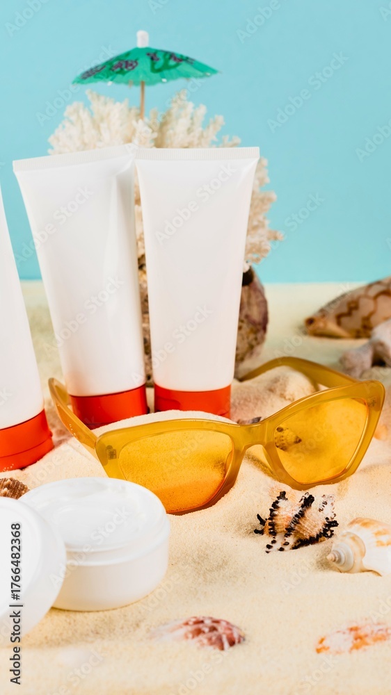 Beach essentials sunscreen and sunglasses on sandy shore