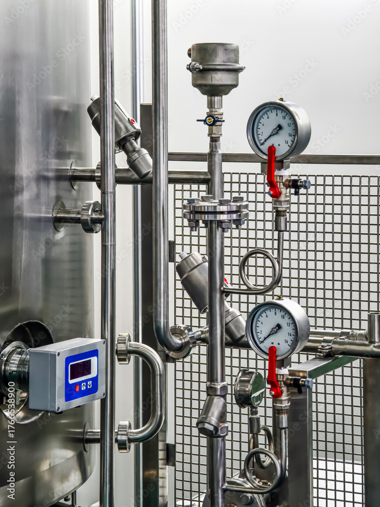 Industrial equipment with pressure gauges and control panel in a modern facility