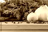 A bulb of garlic, red chili peppers, four-color pepper, and carrot tops on a wooden cutting board. The concept of cooking and vegetables in the home. Garlic - Allium sativum is a species of bulbous